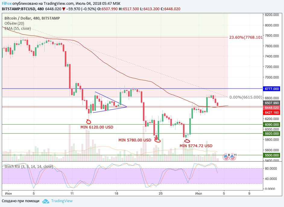 Вчера после непродолжитльной консолидации на нулевом уровне фибоначчи, цена пары BTC/USD откатилась к поддержке скользящей средней EMA55, которая находится сейчас на уровне первоапрельского минимума 6427.16 USD.