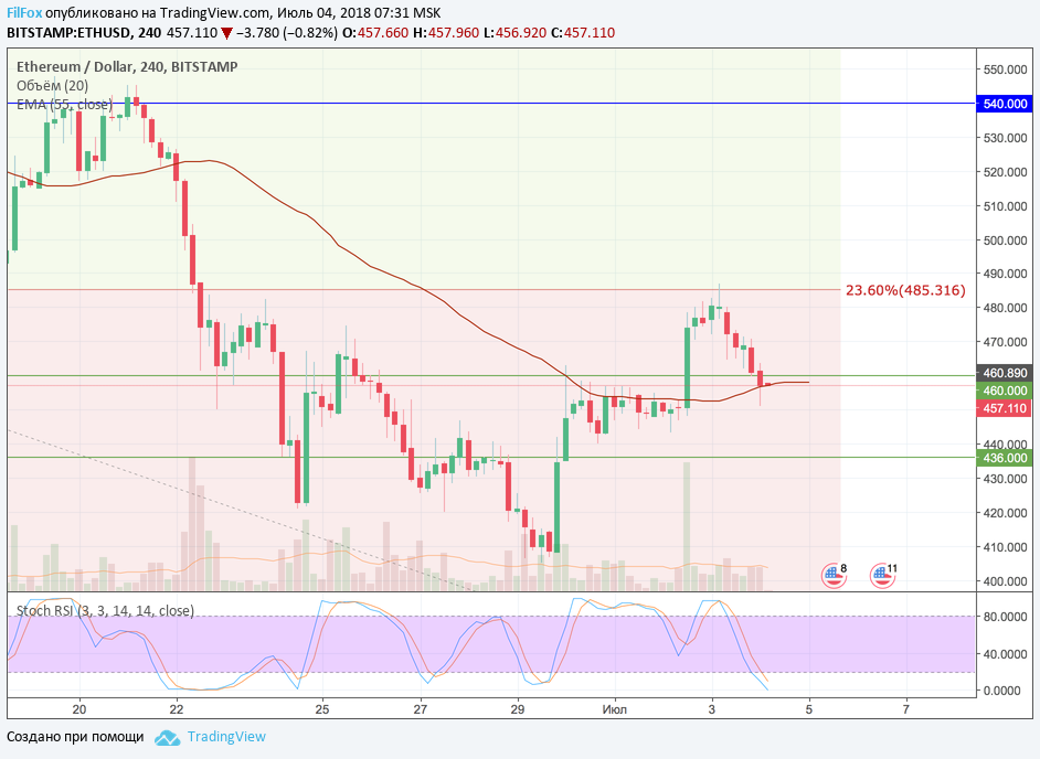 Ethereum вчера проколол уровень сопротивления фибоначчи 23.6% (485.31 USD) и установил дневной максимум в точке 486.99 USD, после чего откатился к уровню средних цен EMA55, который проходит в пределах коридора $460 - $436.