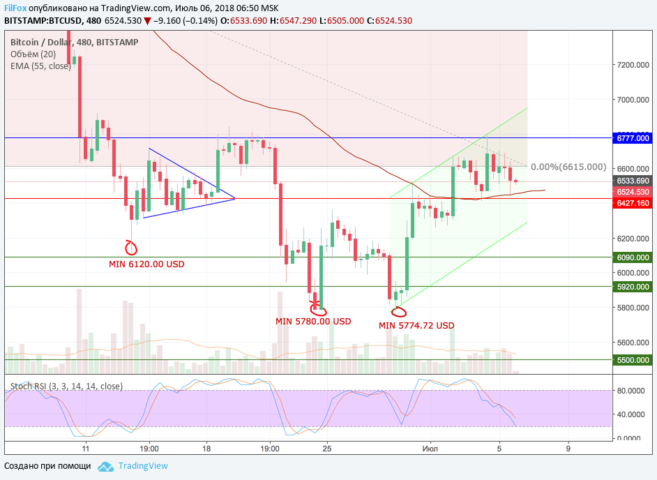 Пауза во флэте затянулась. Вчера цена Bitcoin отказалась выходить из бокового диапазона и весь день консолидировалась возле нулевого уровня фибоначи (6615.00 USD). В завершении дня пара протестировала скользящую среднюю EMA55, установив дневной минимум в точке касания 6445.31 USD.