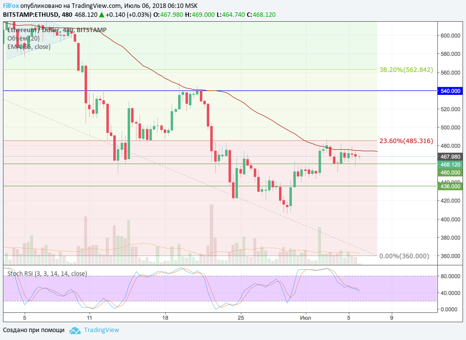 Ethereum вчера весь день продолжал двигаться в узком боковом диапазоне, периодически проверяя на прочность его верхнюю границу в виде скользящей средней EMA55. В завершении вчерашнего дня, пара проколола поддержку нижней границы диапазона, установив дневной минимум на отметке 457.37 USD.