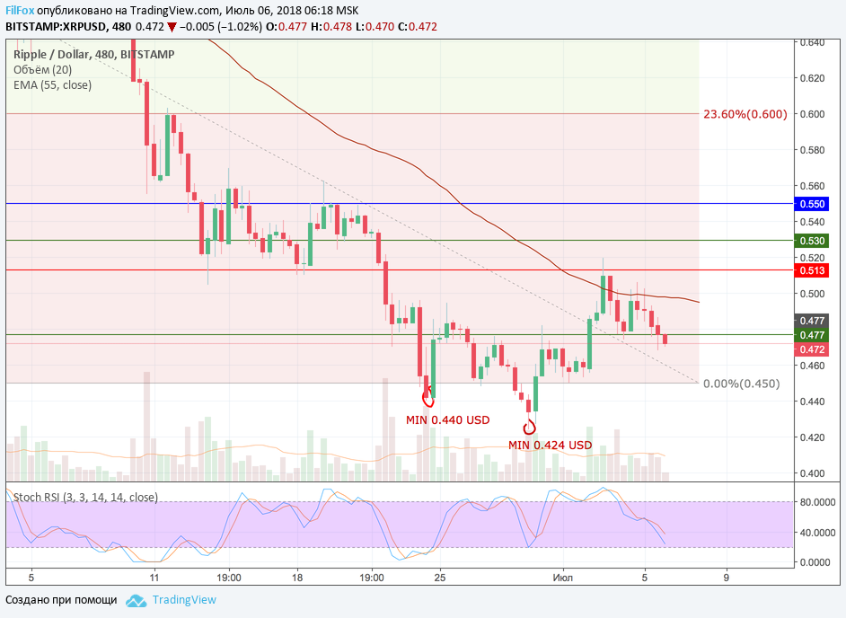 Динамика Ripple больше всех навевает пессимизм на дальнейший ход событий. Вчера цена только проколола уровень поддержки 0.477 USD, а сегодня уже обновила вчерашний минимум и продолжает снижаться к нулевому уровню фибоначчи 0.450 USD. Прорыв этого уровня возобновит нисходящий тренд.