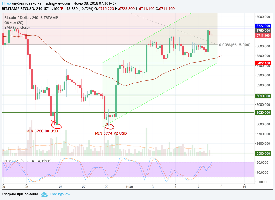 На прошлых выходных Bitcoin протестировал сопротивление первоапрельского минимума 6427.16 USD и на весь уикенд залёг в клиновидном боковике под этим уровнем. Текущая неделя должна была стать исторической. Согласно технического анализа, подтверждением разворота глобального даун-тренда на восходящий тренд, является закрепление цены выше ключевого уровня сопротивления 6777.00 USD.