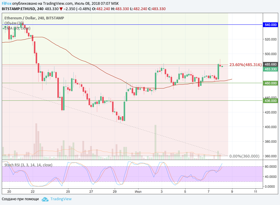 Аналогичная ситуация по динамике BTC наблюдалась на этой неделе и по всем высоколиквидным альткоинам рынка. Ethereum провёл неделю в боковике под уровнем 23.6% фибоначчи (485.31 USD). Цена в начале недели коснулась этого уровня, а потом периодически снижалась в область средних цен. Вчера, после очередного ре-теста скользящей средней, пара получила поддержку от кривой EMA55 и за час смогла перемахнуть через сопротивление 23.6% фибо (485.31 USD).