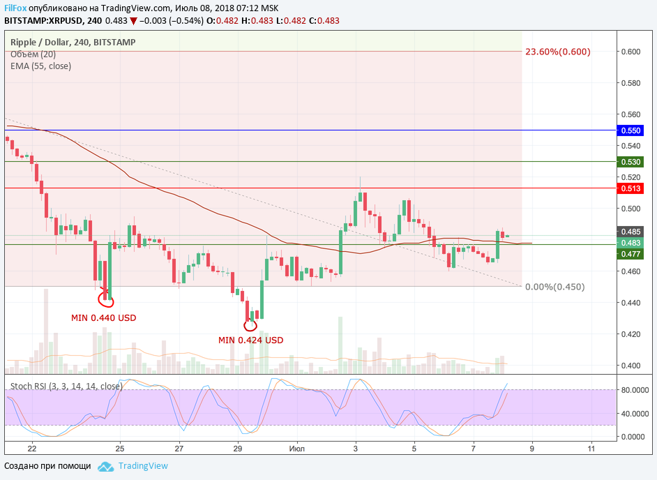 Вчера от дневного минимума 0.464 USD пара на подъёме пробила сопротивление скользящей средней EMA55, которое не удавалось преодолеть с четверга. Полагаем, что при оптимистичном сценарии криптовалютный локомотив BTC/USD сможет быстро поднять XRP из области годовых минимумов, сначала на психологический уровень «50 центов за рипл», а потом ещё выше по ап-тренду.