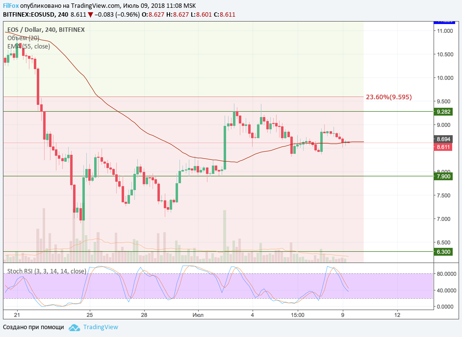 Прогноз по выходу пары из флэта пока не реализовался. Субботний бычий импульс восстановил сползающую цену на максимум в точке 8.99 USD, но вскоре цена всё равно вернулась на уровень средних цен. В настоящий момент цена до сих пор бьётся в узком диапазоне, в области скользящей средней EMA55 (8.650 USD). Повторный бычий импульс от этого уровня сможет реализовать оптимистичный сценарий по ре-тесту уровня сопротивления 9.282 USD.
