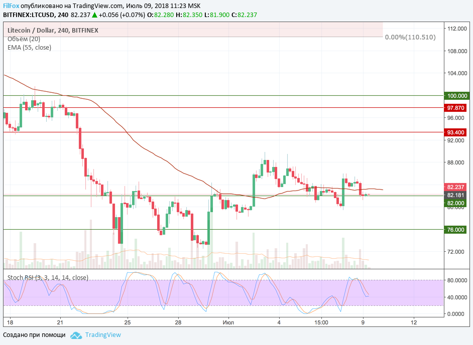Litecoin в субботу установил максимум на отметке 86.00 USD и все выходные цена плавно снижалась. В воскрсенье цена пробила уровень средних цен EMA55 и приостановила снижение встретив поддержку зелёной линии на отметке 82.00 USD. Объёмы торгов довольно малы и цена еле-еле отклоняется от равновесного уровня. Сегодня флэт продолжится, но в скором времени ожидаем выход из этого диапазона и развитие позитивной динамики по нашему оптимистическому прогнозу.