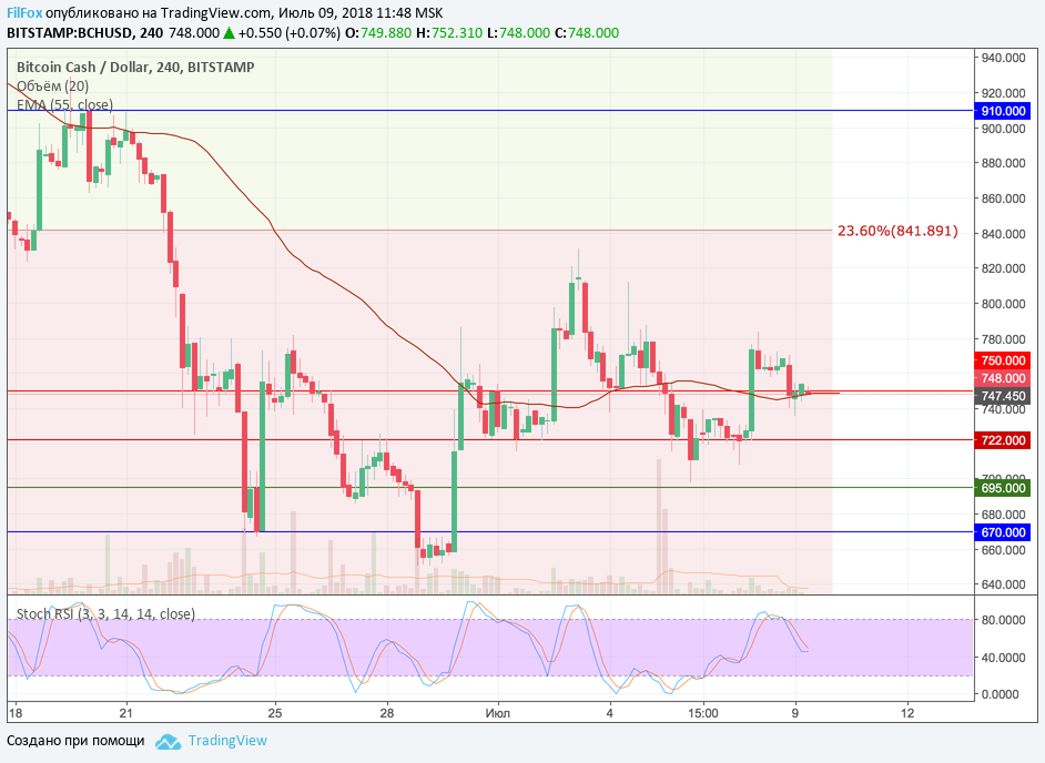 На выходных Bitcoin Cash установил максимум на отметке 783.22 USD и пытался закрепиться выше уровня поддержки 750.00 USD. Вчера во второй половине дня стохастик сформировал сигнал на снижение, и пара в падении пробила уровень 750.00 USD, получив поддержку только на уровне средних цен. Сегодня цена продолжит восстанавливаться в зону флэта и, скорее всего, ограничится еле заметным уровнем сопротивления 777.00 USD.