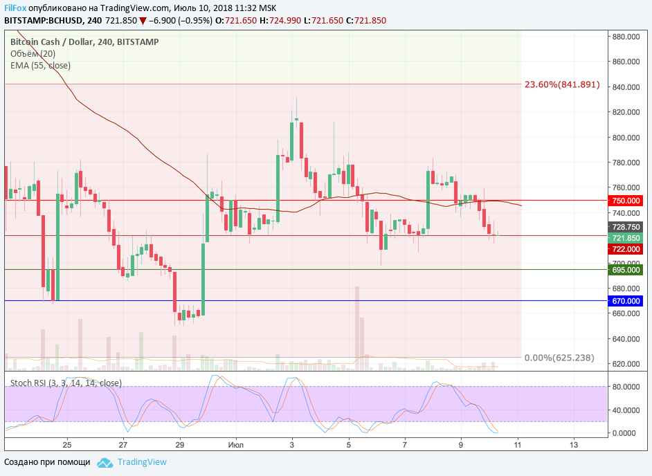 Думаем, что после непродолжительной консолидации возле этой поддержки, цена начнёт восстанавливаться на прежний уровень средних цен. При наличии бычьего импульса по паре BTC/USD, Bitcoin Cash отреагирует прорывом сопротивления 23,6% фибо (841.891 USD).