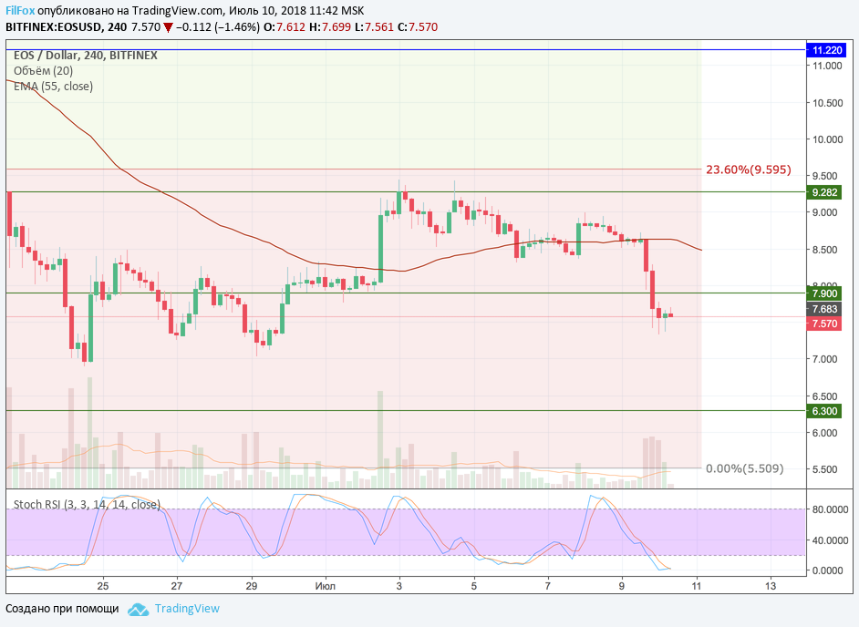 EOS вчера вздремнул в узком коридоре, на уровне скользящей средней EMA55, а проснулся утром глубоко под поддержкой 7.900 USD. В области 7.570 сползание приостановилось, и стохастик подаёт сигнал на возможное восстановление цены. Полагаем, что сегодня, в итоге, пара восстановит статус-кво и вернётся на прежний уровень средних цен.