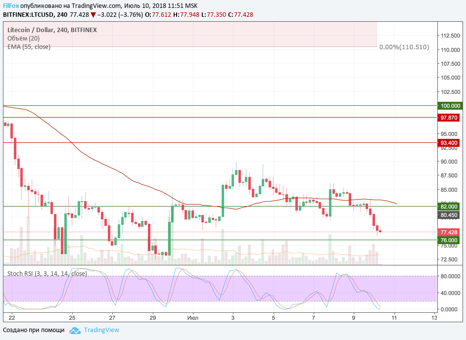 Litecoin сегодня уже успел проделать путь от вчерашней поддержки на уровне 82.00 USD до области 77 долларов за лайт. Обозначив минимум в точке 76.52 USD, цена, не коснувшись линии поддержки 76.00 USD, начала консолидироваться. Стохастик находится в зоне перепроданности, но сигнал на рост ещё не сформировал, однако похоже, что пара намерена восстановиться к скользящей средней EMA55.