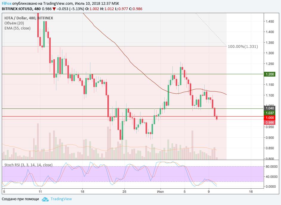 После того, как IOTA на выходных установила максимум в точке 1.149 USD, цена начала постепенно снижаться и, пройдя сквозь уровень средних цен, уже никак не могла вернуться выше него.