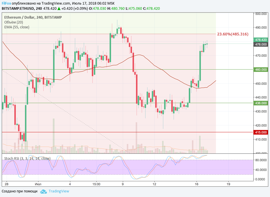 Вчера от уровня средних цен Ethereum развил рост, который начался в воскресенье. Цена пробила верхнюю границу широкого боковика (460.00 USD) и сегодня пытается дотянуться до уровня 23.6% фибо (485.31 USD). Пока на рынке нет подтверждения восходящему тренду, нельзя утверждать, что в ближайшее время цена сможет преодолеть психологический уровень 500 долларов за эфир. Если вчерашние объёмы покупок пропадут, то уже сегодня пара вернётся в пределы широкого бокового диапазона, ограниченного двумя зелёными линиями $460 и $436 и протестирует EMA55.