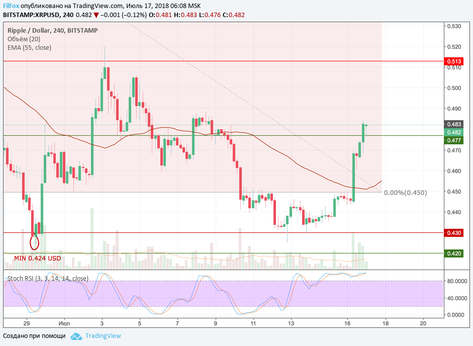 Увлекаемый вчерашним бычьим импульсом пары BTC/USD, Ripple вышел из своего бокового диапазона и прорвав уровень средних цен установил дневной максимум на отметке 0.484 USD. Сегодня нас ожидает откат. Насколько он будет глубокий, опять же, зависит от криптовалютного флагмана BTC/USD. Полагаем, что поддержку при снижении, может оказать скользящая средняя EMA55.