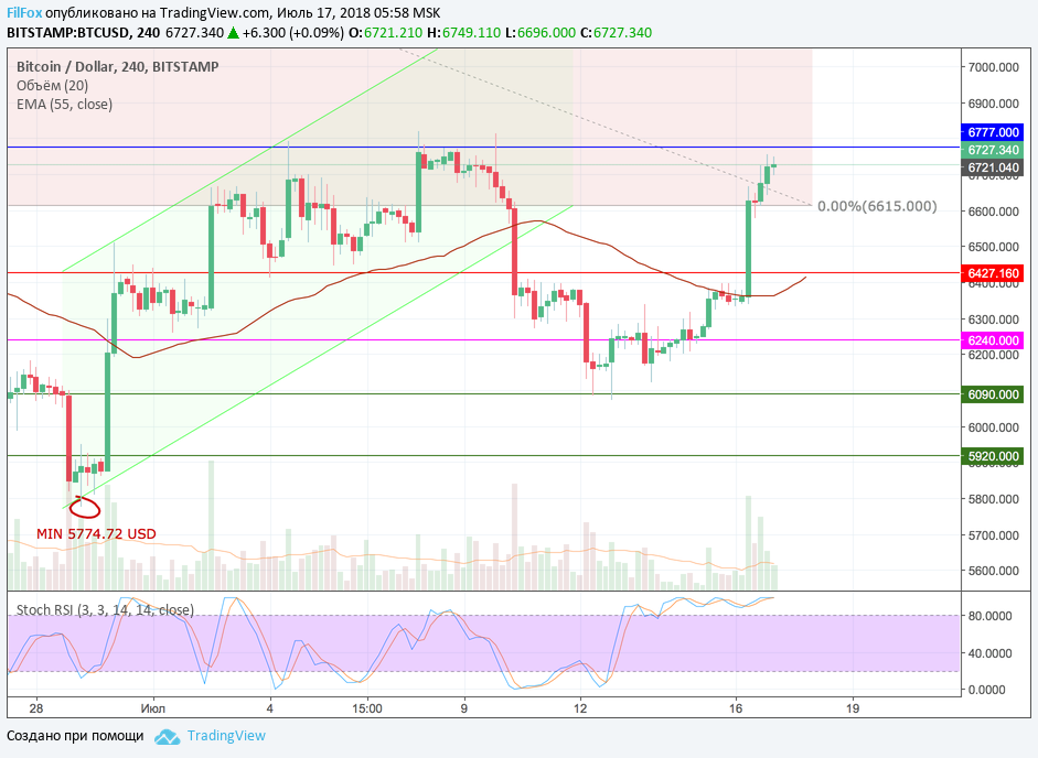 Вчера цена Bitcoin на росте пробила нулевой уровень фибоначи 6615.00 USD и сегодня пытается преодолеть ключевой уровень сопротивления 6777.00 USD. Если сегодня это произойдёт, то в дальнейшем можно ожидать роста и, как мы уже говорили ранее, первый целевой уровень находится на отметке 7200.00 USD.