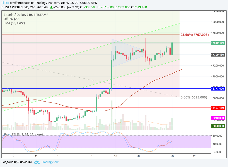 Если объёмы торгов будут выше средних, то пара закрепится выше этого уровня. Однако на малых объёмах, после касания, ожидаем откат к нижней границе зелёного коридора, в область поддержки 7400.00 USD.