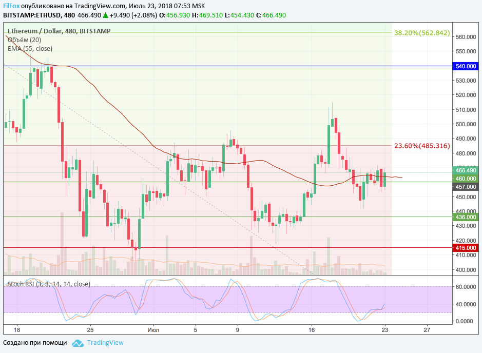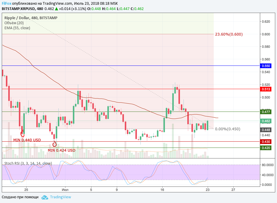 На выходных Ripple удерживался в боковом диапазоне нулевым уровнем фибоначчи (0.450 USD). Когда пара в последний раз тестировала сопротивление нулевого уровня на прочность и отскочила от него, то стохастик на границе зоны перепроданности сформировал сигнал на рост. Теперь ожидается прорыв сквозь скользящую среднюю EMA55 и закрепление ваше уровня поддержки 0.477 USD. Ближайший целевой уровень расположен на отметке 0.513 USD, который будет пробит в завершении этой рабочей недели.