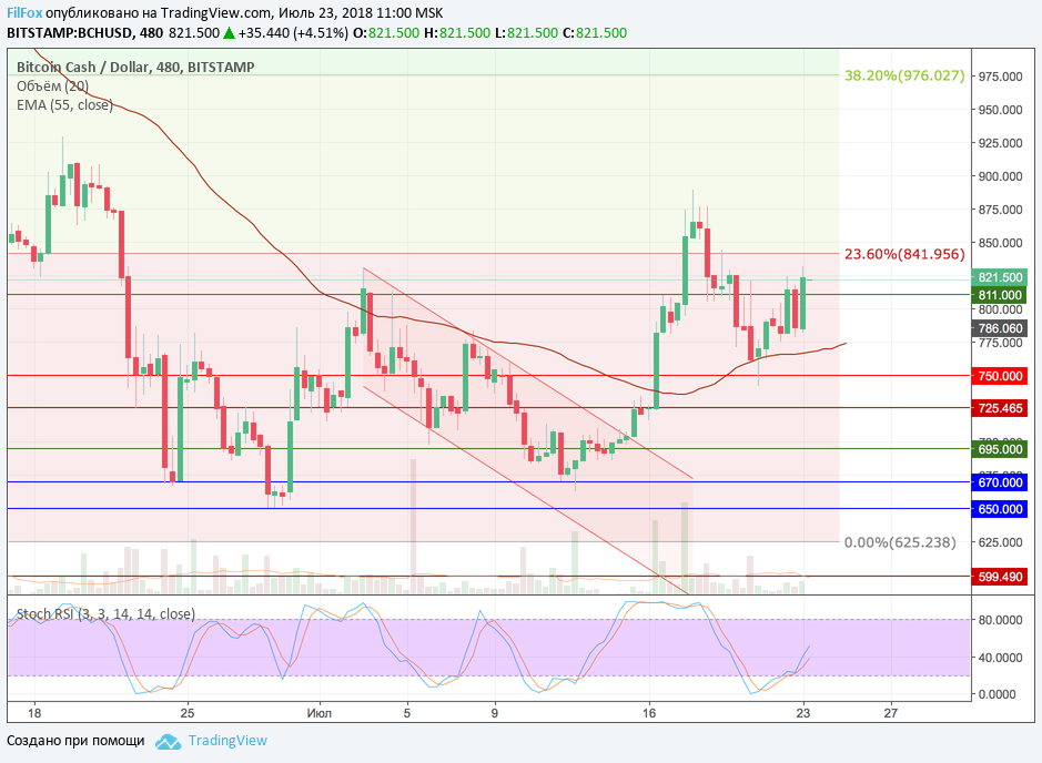 Сегодня сопротивление преодолено и пара BCH/USD может закрепиться над уровнем 23.6% фибо (841.95 USD), после неглубокого отката к поддержке 811.00 USD. Новая цель, которая должна покориться паре на этой неделе - это уровень 909.00 USD.