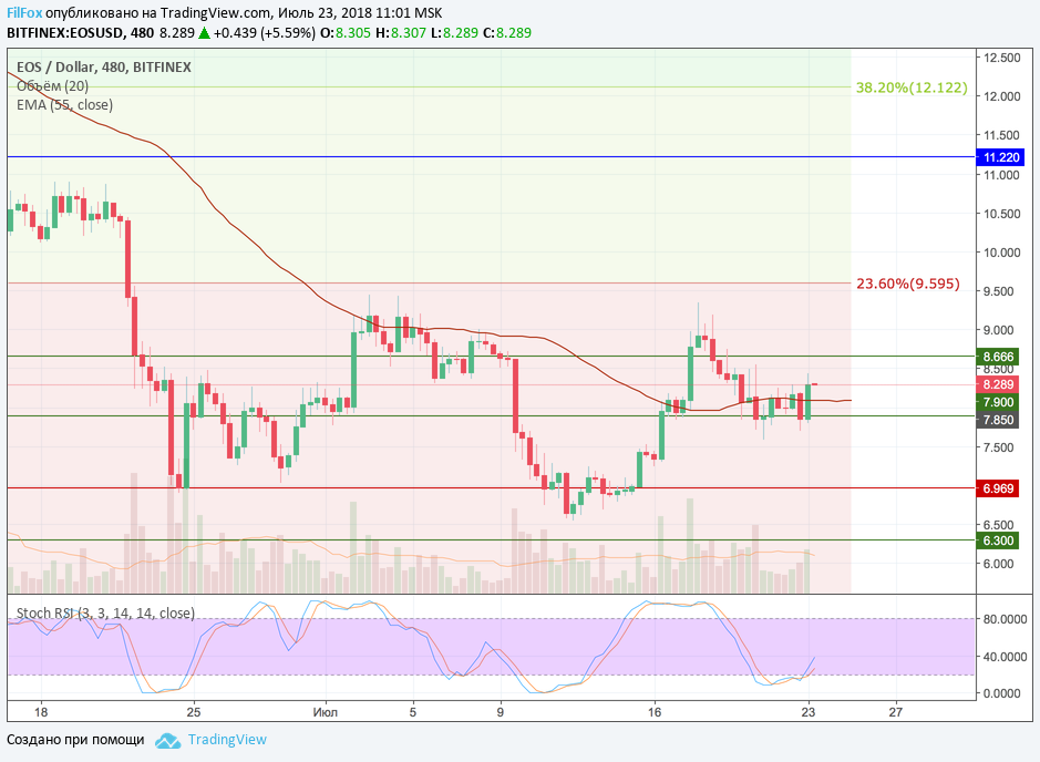 Уровень 7.90 USD оказал поддержку паре EOS/USD и на выходных цена консолидировалась в области средних цен. Иногда амплитуда боковика пробивала поддержку 7.900 USD, но начало недели пара всё-таки встретила над уровнем скользящей средней EMA55 (8.04 USD). После сегодняшнего дневного максимума 8.43 USD, EOS вновь пытается найти опору на уровне средних цен. В ближайшее время ожидаем закрепление цены над уровнем 8.666 USD.