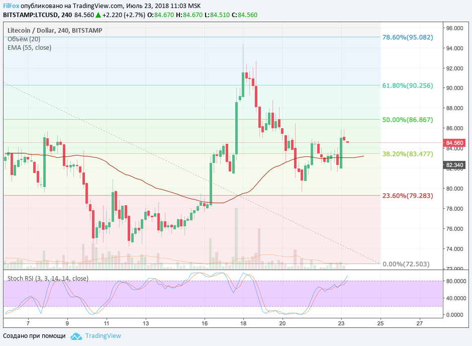 На седьмом месте, по капитализации, пара LTC/USD имеет в своём активе 4.8 млрд долларов и если рост пары продолжится до 50% фибо (86.86 USD), то Litecoin ещё поборется со Stellar за шестую строчку в рейтинге Market Cap.