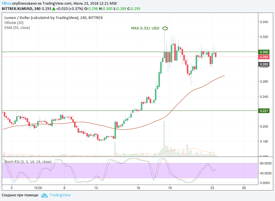 Обошел пару Stellar Lumens (XLM), увеличив свою капитализацию до уровня 5.5 млрд долларов США. В начале прошлой недели пара XLM/USD стартовала от отметки 0.221 USD, имея капитализацию $4.1 млрд, а уже в к середине недели пара установила максимум на отметке 0.331 USD. После отката цена консолидируется под уровнем сопротивления 0.300 USD, не желая уступать Litecoin почетное место во второй тройке по уровню капитализации.
