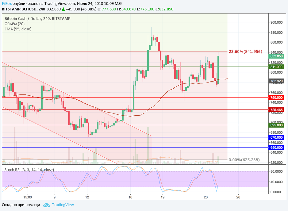 Вчера паре BCH/USD почти удалось закрепиться над уровнем поддержки 811.00 USD, но поздно вечером странный медвежий импульс выбил цену опять в область средних цен. Сегодня утром паре заново пришлось начинать рост от уровня скользящей средней EMA55 и вчерашняя цель на уровне 23.6% фибо (841.95 USD) была преодолена в течении трёх часов непрерывного роста. В ближайшее время ожидается откат от максимума в районе 850.00 USD. Глубина отката может находится ориентировочно в области поддержки 811.00 USD.