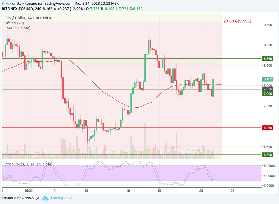 После вчерашнего утреннего максимума на уровне 8.43 USD, EOS вновь откатился к уровню средних цен, но EMA55 не смогла удержать пару в боковике и вечером был зафиксирован минимум в точке 7.81 USD. Поддержка 7.90 USD существенно замедлила снижение пары и сегодня утром цена продолжала рост уже от этого уровня. Полагаем, что сегодняшний дневной максимум ограничится отметкой 8.20 USD и потом последует откат к поддержке 7.90 USD.