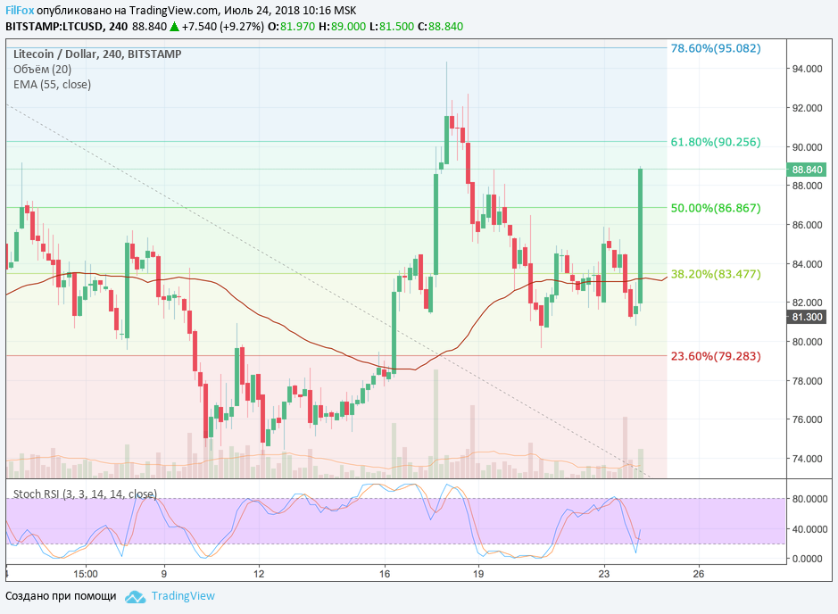 Litecoin вчера на снижении пробил поддержку уровня 38.2% фибо (83.47 USD) и закрыл котировки дня на отметке 81.41 USD. Ночью снижение ещё некоторое время продолжалось и развернулось в рост на минимуме 81.04 USD. Утром, подстёгиваемая желанием отыграть у Stellar шестое место в рейтинге Market Cap, цена Litecoin пробила два уровня фибоначчи и установила дневной максимум в точке 89.00 USD. Но по оценке CoinmarketCap это увеличило капитализацию только до 5 млрд долларов США, что, по-прежнему, оставляет LTC на седьмом месте в рейтинге.