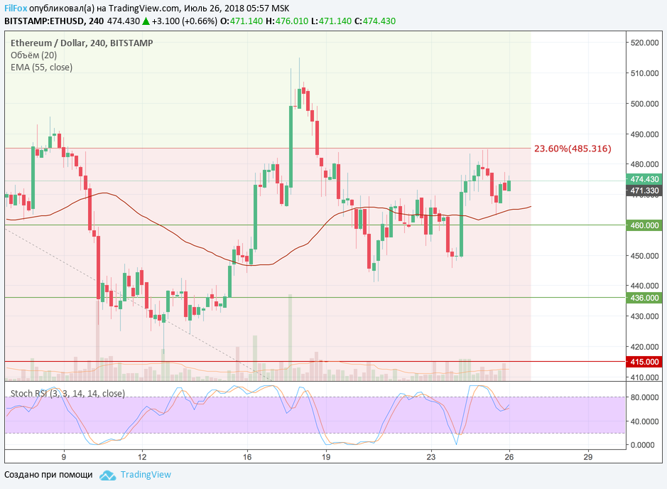 Вчера сопротивление на уровне 23.6% фибо (485.31 USD) развернуло восхождение пары ETH/USD на снижение. Протестировав область средних цен, снижение закончилось. Из района 468.00 долларов за эфир пара возобновила попытки пробить сопротивление уровня 23.6% фибоначчи. Объёмы торгов небольшие, поэтому нет надежды, что эта попытка окажется более успешней, чем предыдущая.