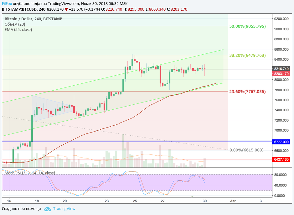 Консолидация цены в области 8200.00 USD затягивается. На четырёхчасовом тайм-фрейме появился сигнал стохастика на снижение. Вероятно, что перед прыжком вверх цена решила немного присесть. Уровень, на который может откатиться пара находится на нижней трендовой границе восходящего коридора. Это примерно область 7800.00 USD.