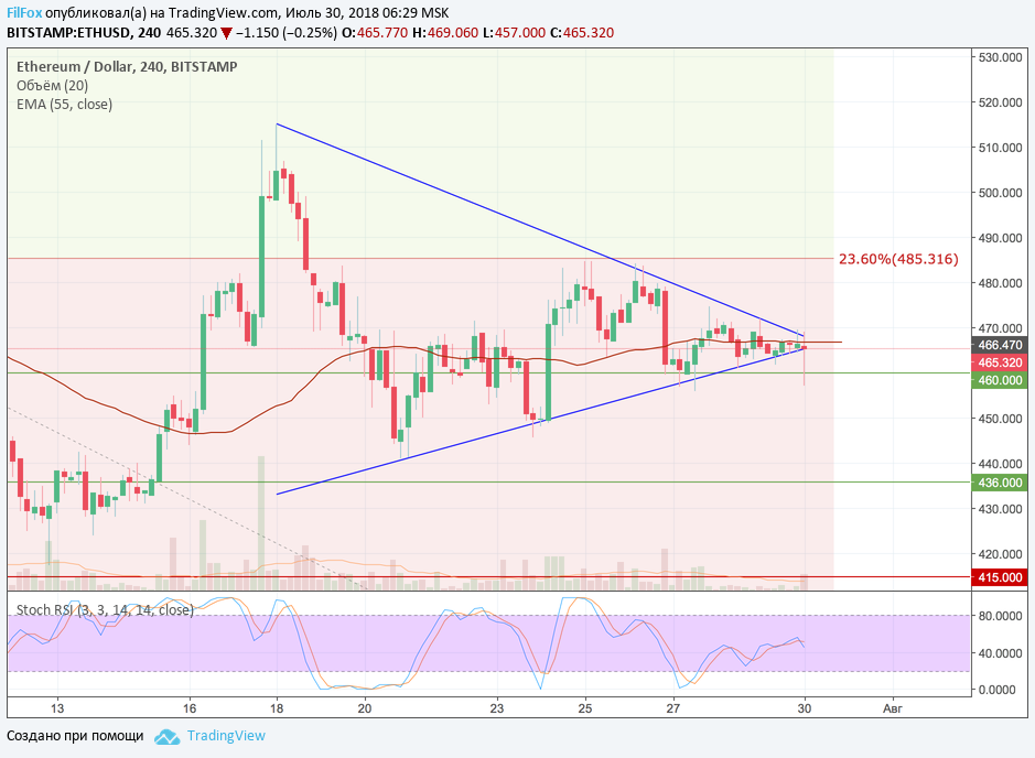 Цена Ethereum на выходных продолжала недельный боковик в сужающемся диапазоне. Сегодня произойдёт выход из графического паттерна «вымпел» и судя по показанию стохастика (который сейчас в нейтральной зоне), выход может быть направлен против тренда, в сторону снижения. Полагаем, что при таком исходе из флэта, цена может просесть до уровня 460.00 USD. Этот уровень поддержки, во второй половине недели, развернёт пару ETH/USD в рост, к цели «520 долларов за эфир».