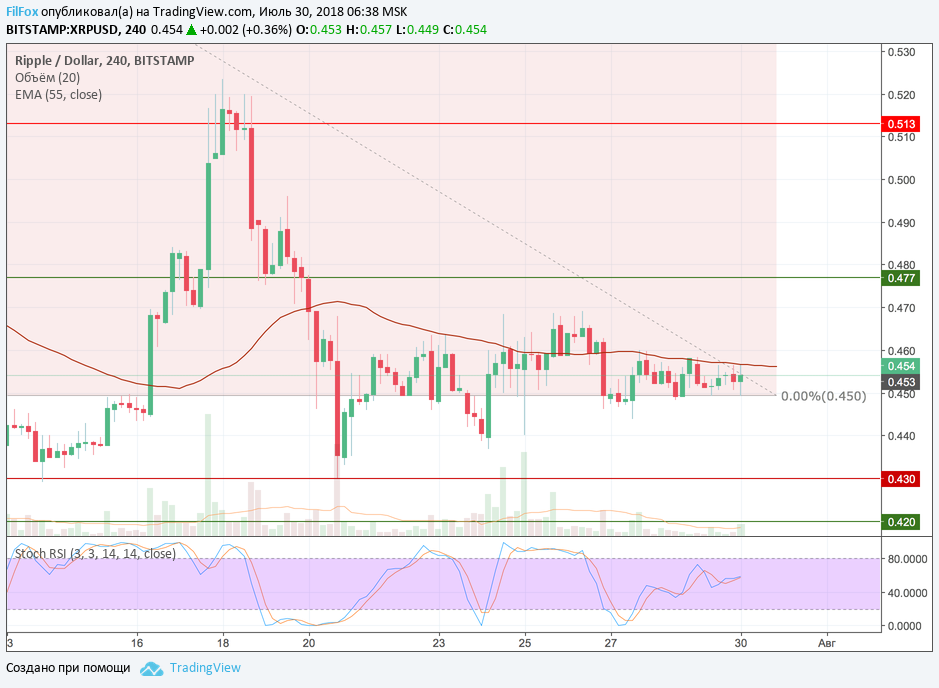В воскресенье Ripple продолжил консолидироваться в диапазоне между скользящей средней EMA55 и нулевым уровнем фибоначи (0.450 USD). Сегодня одной свечой была протестирована и нижняя, и верхняя граница диапазона. Если выход из диапазона пройдёт в направлении снижения, как показывает стохастик, то уровень 0,440 USD может оказать поддержку паре и вернуть цену в диапазон.