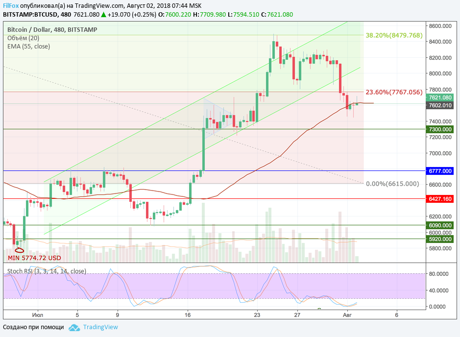 Если взглянуть на восьмичасовой тайм-фрейм, то можно увидеть, что скользящая средняя EMA55 удерживала цену от дальнейшей просадки и служила опорой для ре-теста 23.6% фибо (7767.00 USD). Однако, это не помешало цене установить минимум в точке 7440.00 USD, а восстановиться до уровня сопротивления так и не получилось.