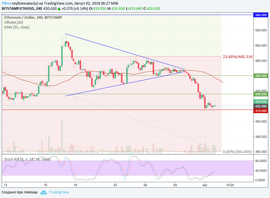 Вчера цена Ethereum несколько раз пыталась пробить поддержку 415.00 USD, но каждый раз этот уровень возвращал цену в диапазон между линиями $436 и $415. Полагаем, что сегодня цена продолжит движение в этом коридоре и протестирует его верхнюю границу.