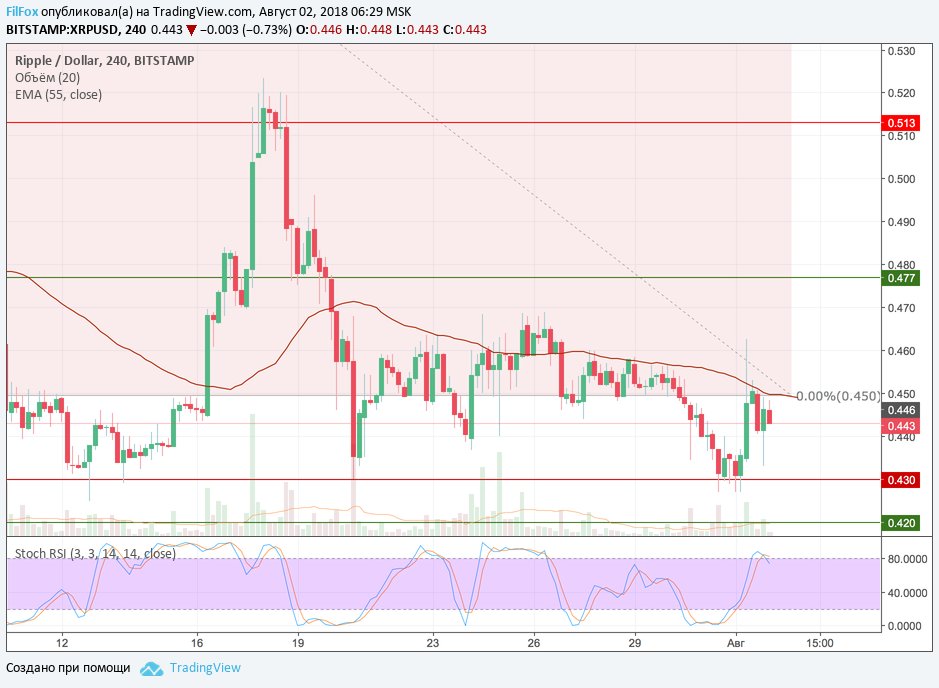 Вчера Ripple консоидировался над уровнем поддержки 0.430 USD, а потом, после внезапного бычьего импульса пробил сопротивлеие нулевого уровня фибоначчи (0.450 USD). Установив максимум на отметке 0.463 USD, цена постепенно вернулась в диапазон между сопротивлением 0.450 USD и поддержкой 0.430 USD. Сегодня движение в боковом диапазоне продолжится.