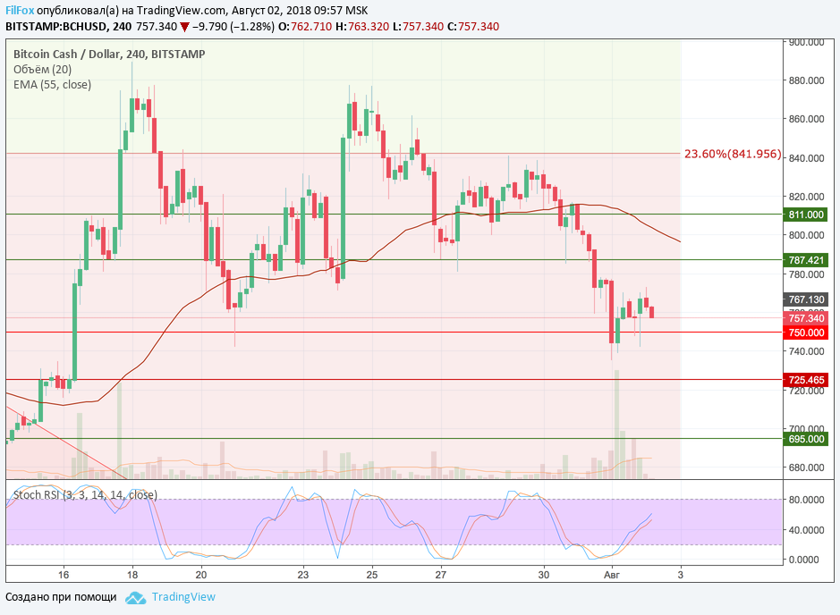 Вчера цена Bitcoin Cash пробила поддержку 750.00 USD и установила минимум в точке 735.00 USD. В течение дня цена смогла восстановиться в боковик над этим уровнем поддержки. Сегодня флэт продолжится, но отклонения от равновесного состояния будут увеличиваться. Снизу амплитуду ограничит поддержка 725.46 USD.
