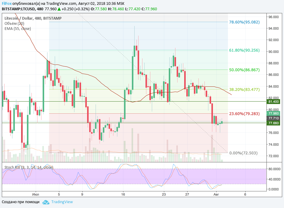 Litecoin вчера консолидировался вдоль уровня 77.66 USD. Восьмичасовые свечи несколько раз своими тенями прокалывали этот уровень поддержки, но цена всякий раз возвращалась к нему.