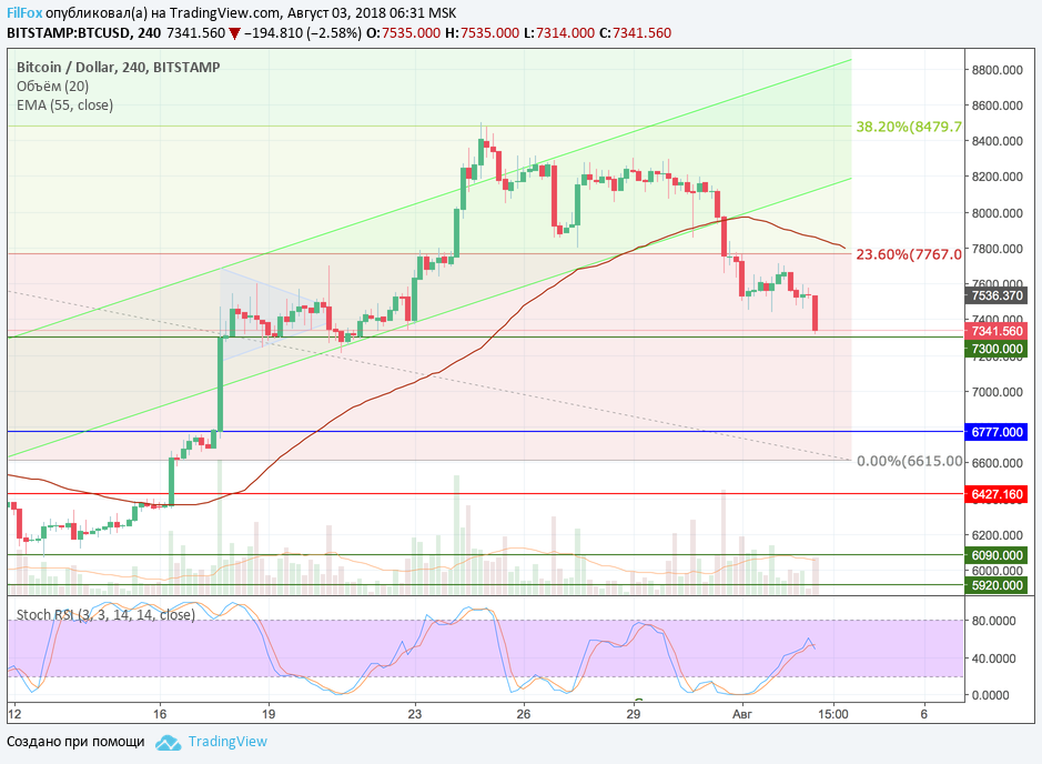 Вчера цена Bitcoin пыталась ре-тестить уровень сопротивления 23.6% фибо (7767.00 USD), но немного не дотянув до уровня, восстановление закончилось и возобновилось снижение. Сегодня снижение продолжится и достигнет уровня поддержки 7300.00 USD.