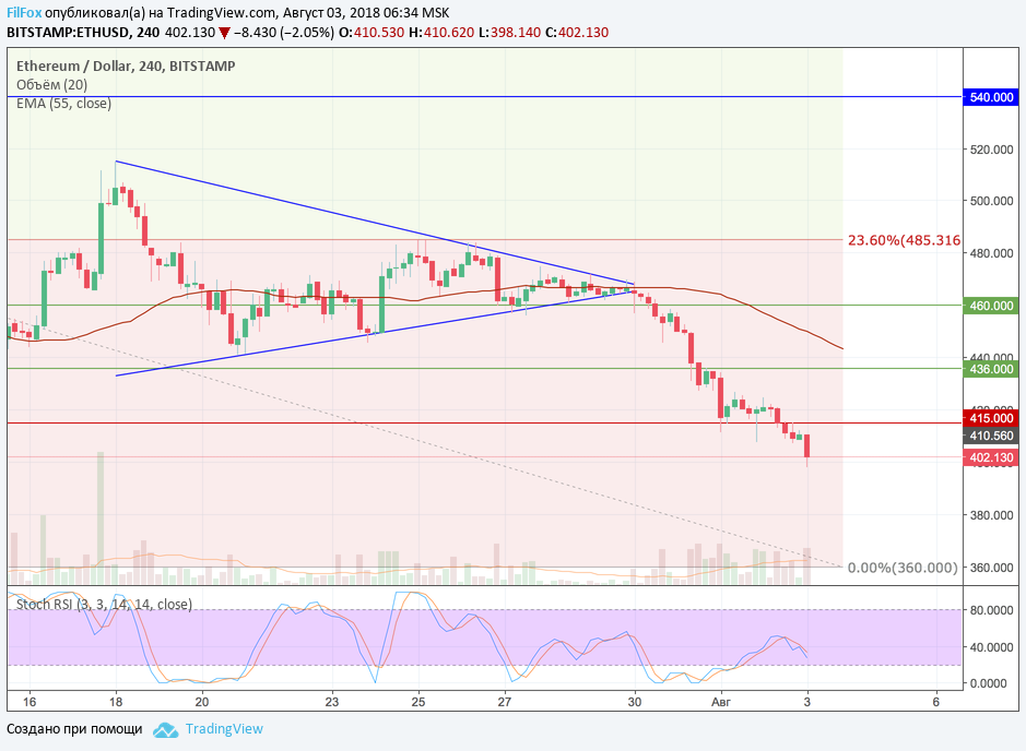 Вчера пара находилась в боковом диапазоне между линиями $436 и $415, но вечером поддержка не смогла больше удерживать цену в этом коридоре и цена провалилась вниз, в область цен 400.00 долларов за эфир.