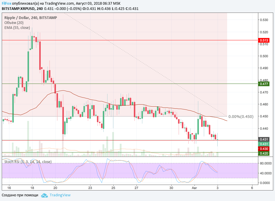 Вчера Ripple находился в боковом диапазоне и уровень 0.430 USD удержала пару в пределах боковика, несмотря на то, что тень четырёхчасовой свечи глубоко проколола его, установив минимум в точке 0.425 USD. Cегодня пара попытается восстановится к верхней границе диапазона и продолжит флэт.