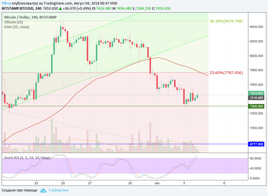 Вчерашнее снижение достигло уровня поддержки 7300.00 USD. Объёмы торгов в районе минимума - выше средних, судя по всему, интенсивность падения снижается. Цена начала консолидироваться над этим уровнем поддержки. На восьмичасовом графике, в зоне перепроданности, уже есть сигнал стохастика на рост.