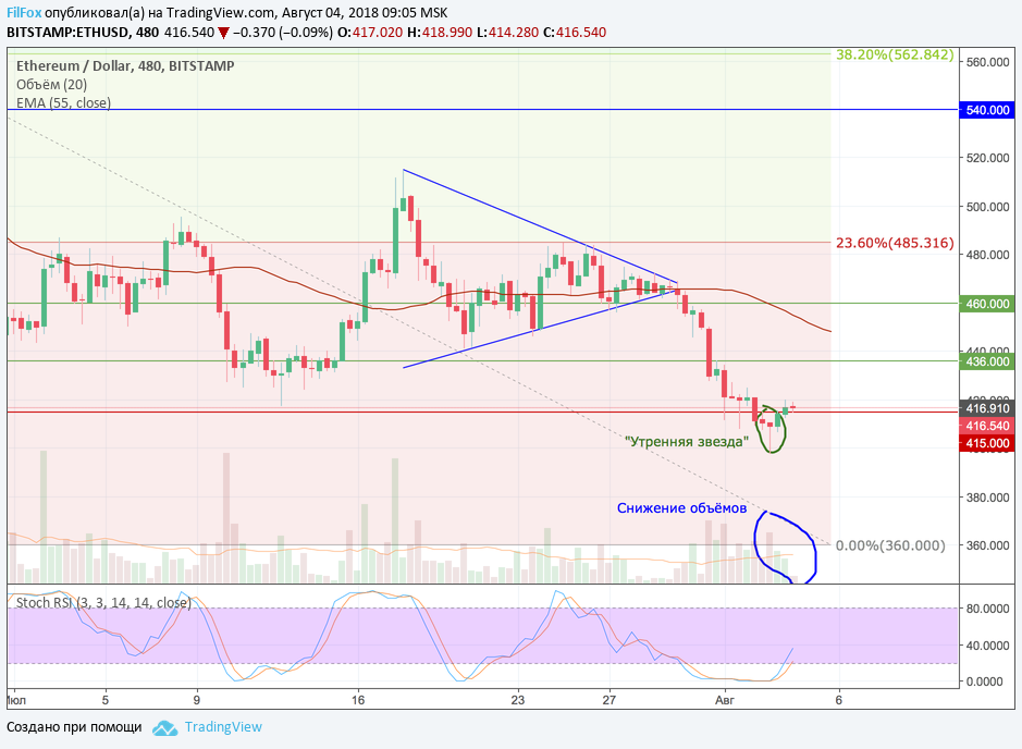 Вчера, развернувшись в точке минимума 397.41 USD, цена Ethereum восстановилась над уровнем поддержки 415.00 USD. Сформировался свечной паттерн «Утренняя звезда», который является разворотным сигналом. И хоть на восьмичасовом графике мы видим сигнал стохастика на рост, зелёные свечи формируются на уменьшающихся объёмах. Это признак ослабления покупателей и продолжения снижения в зону 380 долларов за эфир.