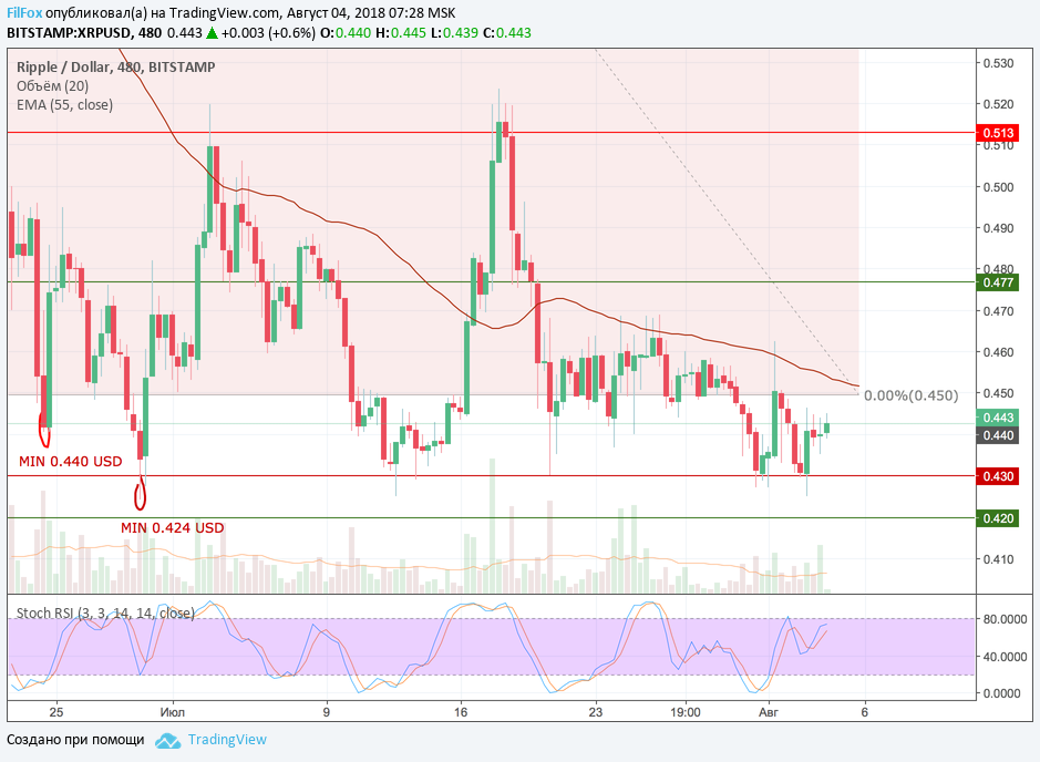 Вчера цена пары восстановилась в пределы коридора боковика и пыталась протестировать верхнюю границу в виде нулевого уровня фибоначчи (0.450 USD). Объёмы покупок хоть и превышали средний уровень, но протестировать верхнюю границу коридора так и не удалось.