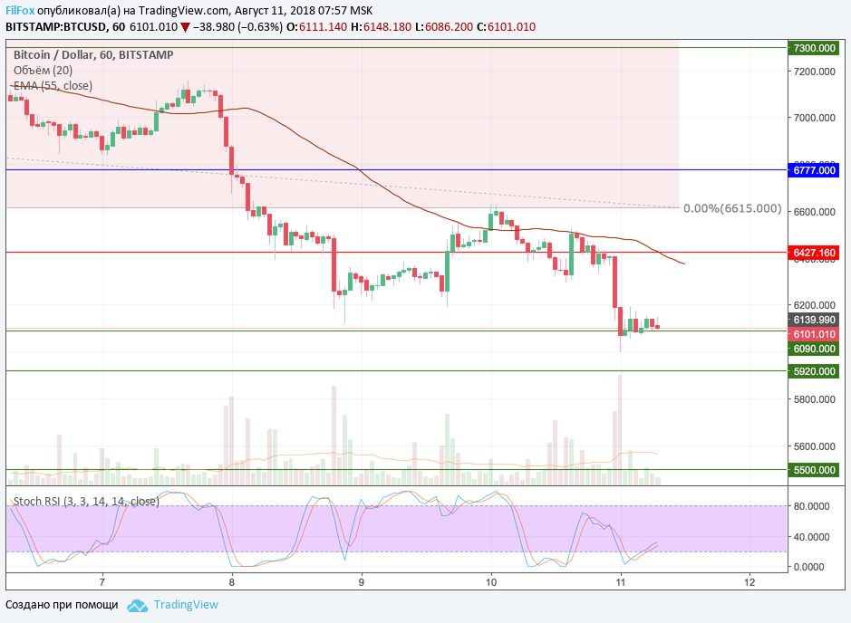 Вчера, цена на Bitcoin снизилась от уровня первоапрельского минимума (6427.16 USD) к поддержке 6090.00 USD. Резкое снижение завершилось дневным минимумом в точке 5995.75 USD. После этого давление на цену немного ослабло и пара консолидируется над поддержкой 6090.00 USD.