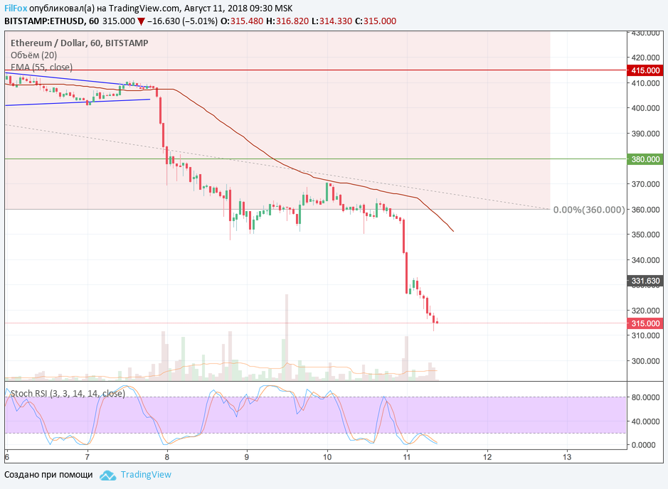 Вчера за 15 минут до закрытия дня, цена ETH находилась в районе 340.00 долларов за эфир. Но активное медвежье давление продолжалось ещё около полутора часов, после чего падение ненадолго приостановилось в области 320 долларов. Затем, до самого утра, цена продолжила устанавливать новые годовые минимумы. Зафиксировать хоть какой-то более или менее постоянный минимум удалось только в точке 311.64 USD. Сколько он сможет продержаться при такой волатильности рынка - неизвестно.