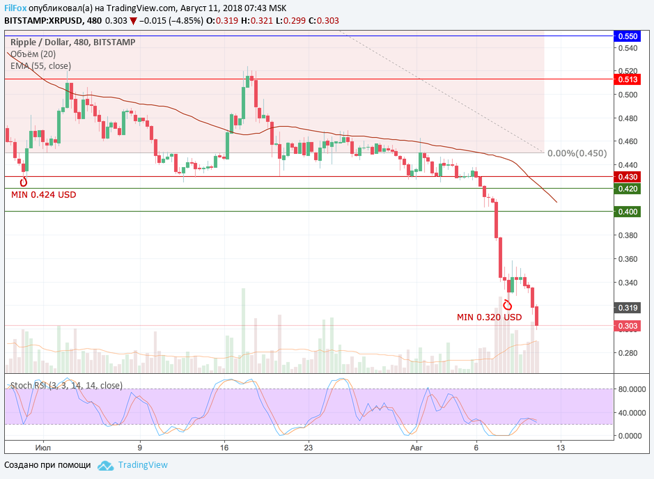 Ripple вчера снижался и на закрытии дня цена находилась в области 0.310 USD. Но долго продержаться в этом районе цен не удалось, так как сегодня пара уже пробила психологический уровень 0.300 USD. В результате имеем минимум в точке 0.293 USD, который вот уже около часа носит гордое звание «минимум 2018 года».