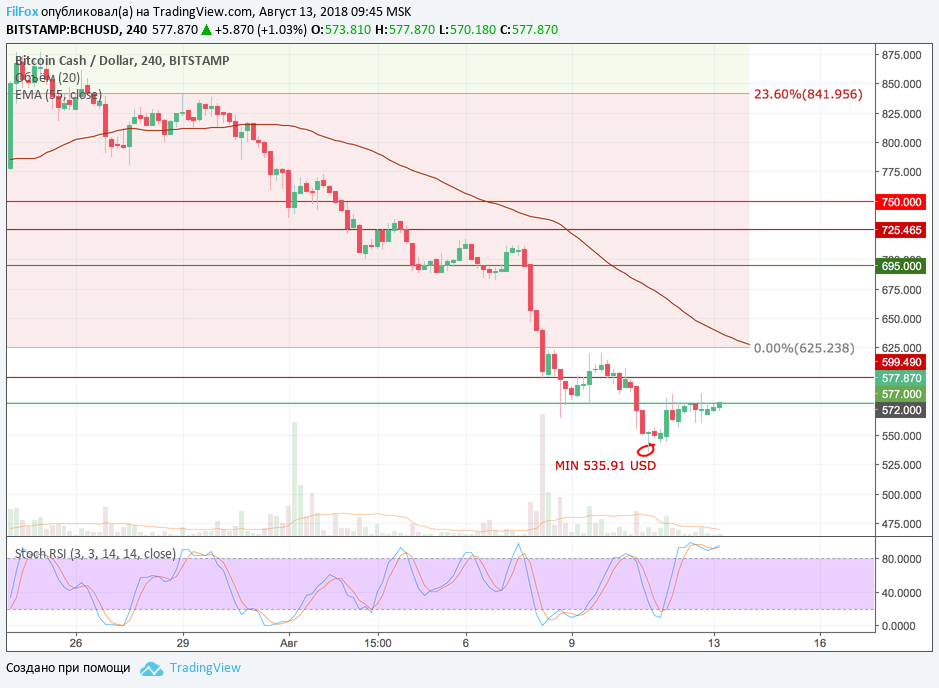 На выходных, обновив абсолютный минимум до уровня 535.91 USD, Bitcoin Cash перешел в коррекцию. Поддерживая корреляционную зависимость от пары BTC/USD, цена пары BCH/USD восстанавливаясь, пыталась пробить сопротивление уровня 577.00 USD. Самая удачная попытка прорыва закончилась максимумом в точке 586.00 USD. На большее у быков не хватало сил.