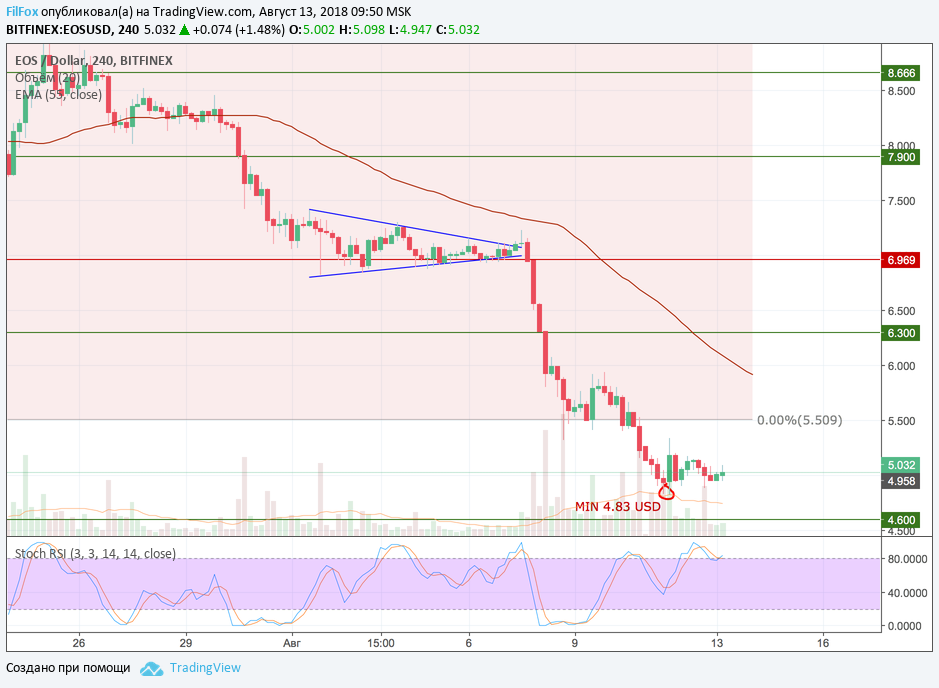 На выходных EOS установил минимум в точке 4.83 USD и после небольшой коррекции пара перешла в консолидацию на уровне 5.00 USD.