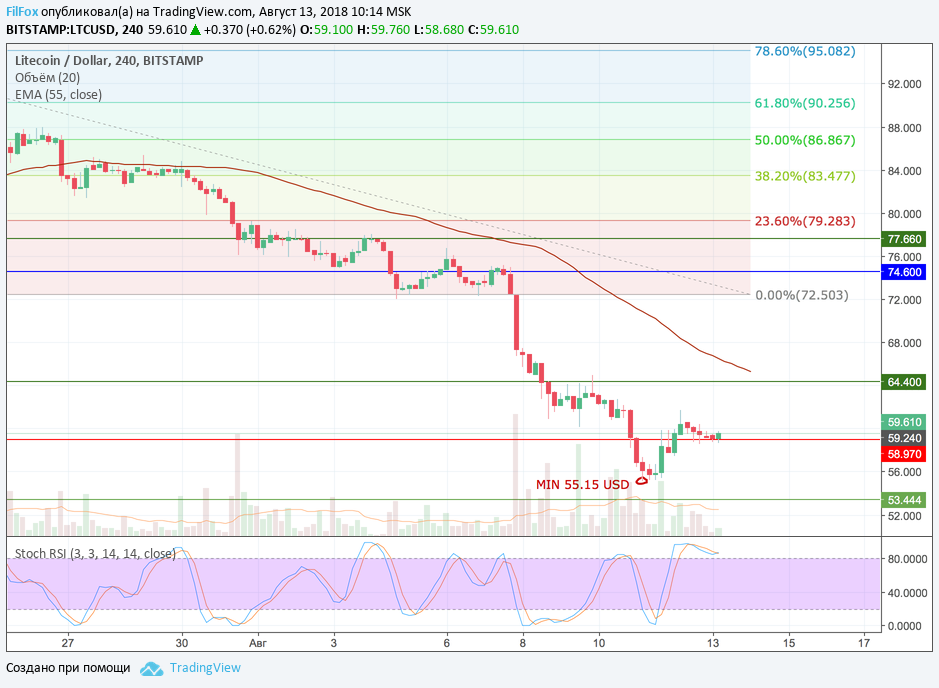 После того, как медведям удалось продавить поддержку на уровне 58.97 USD, пара обновила годовой минимум в точке 55.15 USD. От минимального уровня Litecoin выкупали достаточно большими объёмами и цену удалось вернуть к поддержке 58.97 USD. Над этим уровнем цена пытается консолидироваться и хоть стохастик находится в зоне перекупленности, довольно вероятен ре-тест сопротивления 64.40 USD.