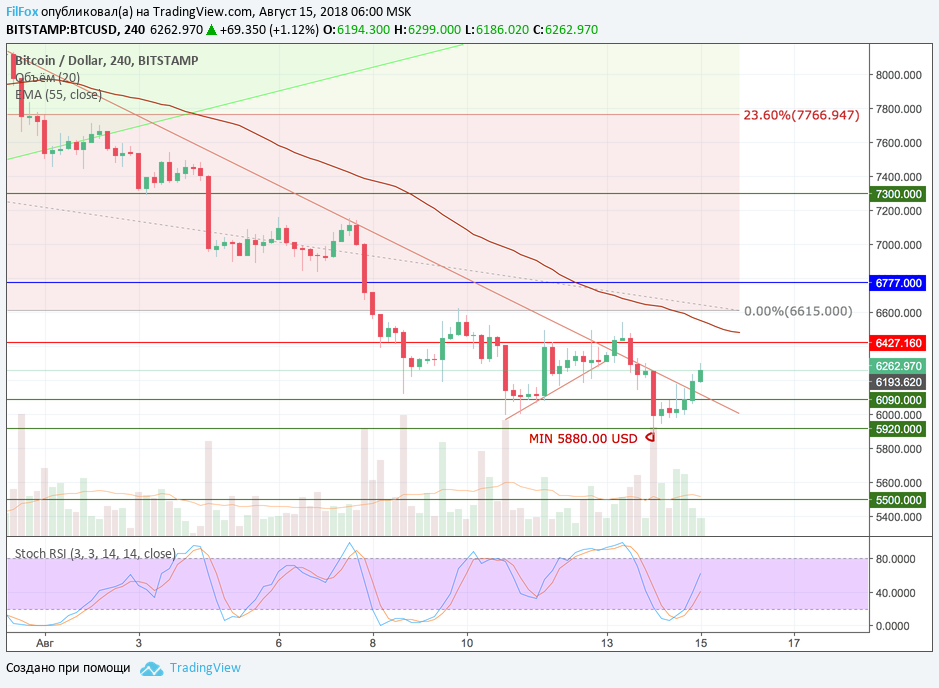 Вчера цена BTC проколола уровень поддержки 5920.00 USD, установив локальный минимум в точке 5880.00 USD. Годовой минимум 5774.72 USD ещё не обновлён, но этому уровню не долго осталось удерживать этот титул антирекорда. После отскока от локального минимума цена коснётся уровня сопротивления 6427.16 USD.