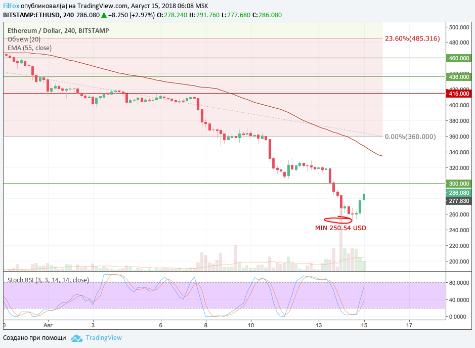 После установления годового минимума в точке 250.54 USD и отскока в область 270 долларов за эфир, давление медведей возобновлялось, но продавить ниже уже установленного минимума не удалось. Цена, во второй раз, отскочила ещё выше, в район 290.00 USD. Сегодня, на уменьшающихся объёмах, возможен ре-тест линии сопротивления 300.00 USD и возобновление снижения.